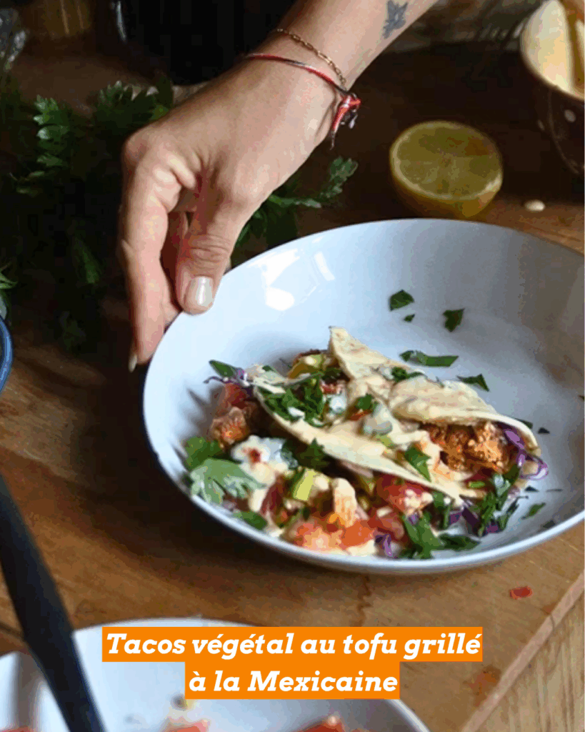 Réchauffer les tortillas à sec ou au four. Monter les tacos : étaler le fromage frais puis disposer le chou rouge, le tofu grillé et les tomates/oignons, un peu de coriandre fraîche, un filet de citron… et c’est prêt !