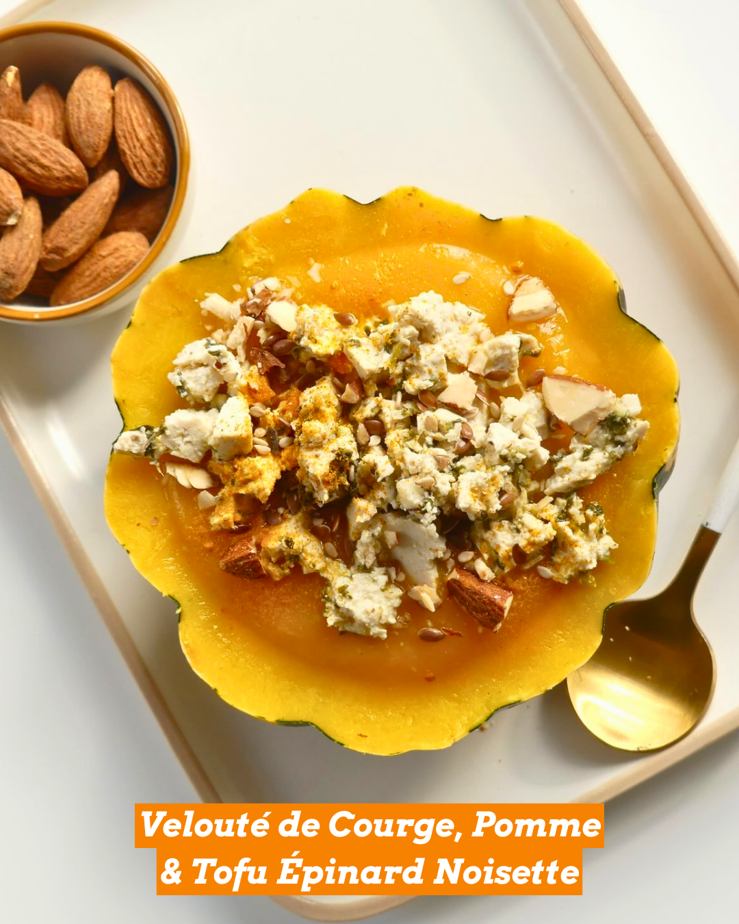 Émietter le tofu épinard noisette, ajouter les toppings puis servir.